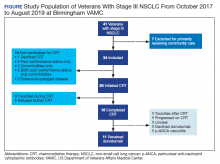 The Birmingham VAMC Outpatient Oncology Clinic billing data identified all individuals diagnosed with lung cancer treated between October 2017 and August 2019. Patients who did not have NSCLC that was stage III and unresectable were excluded from our study. Patients who did not receive a majority of their treatment at US Department of Veterans Affairs (VA) facilities were excluded as well. Each patient’s demographic, functional level, and tumor characteristics during the treatment planning phase and follow-up visits were obtained. Two investigators who evaluated health care provider documentation using the VA Computerized Patient Record System (CPRS) conducted chart reviews.