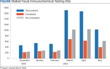 At program launch, the VACHS had 4642 patients due for CRC screening who were eligible for the mailed FIT program. On March 7, 2023, the data consisting of FIT tests ordered between December 2022 and May 2023—3 months before and after the launch of the program—were reviewed and categorized. In the 3 months before program launch, 1528 FIT were ordered and 714 were returned (46.7%). In the 3 months after the launch of the program, 4383 FIT were ordered and 1712 were returned (39.1%) (Figure). Test orders increased 287% from the preintervention to the postintervention period. The mean (SD) number of monthly FIT tests prelaunch was 509 (32.7), which increased to 1461 (331.6) postlaunch.
