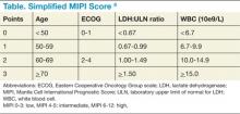 Though pathologic features are beyond the scope of this manuscript, when a definitive diagnosis is made, it is important to differentiate the more aggressive blastoid variant from the more typical pathologic patterns. The indolent form of MCL is diagnosed by clinical presentation as described below. In addition, quantitation of Ki-67 can add prognostic value.1-6 Patients with tumors that express higher levels of Ki-67 have higher relapse rates and shorter overall survivals.2,3,5 The Mantle Cell Lymphoma International Prognostic Index (MIPI) segregates patients into low-, intermediate-, and high-risk groups based on the clinical factors of patient age, performance status, serum lactate dehydrogenase, and total white blood cell count (WBC) (Table). Use of the MIPI at both initial diagnosis and before first-line autologous HCT can also offer significant prognostic value.1-7 Patients with higher MIPI scores have shorter overall survivals.7,8
