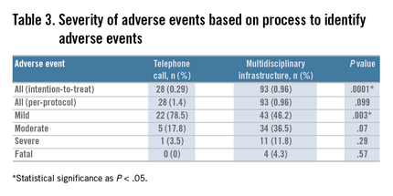 We compared the proportion of patients with adverse events as well as the type and severity of the events associated with gastrointestinal endoscopy, as identified by direct patient contact by telephone, with the proportion, type, and severity of events identified through our MDI, using the chi-square statistic for larger sample sizes (e.g., the proportion of overall adverse events in each tracking mechanism group) and the Fisher exact test for smaller sample sizes (e.g., comparing the type of adverse event in each tracking mechanism group). We used both an intention-to-treat and per-protocol analysis.