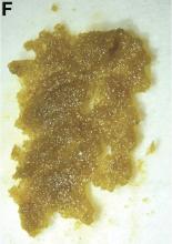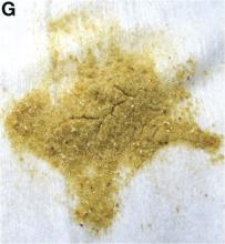 The level of lead in ground jineijin (Figure F, the drug the patients consumed is mainly processed by mixing ground jineijin and honey; Figure G, the deposit left after the elution of honey in Figure F is ground jineijin) and squama mantis was measured with inductively coupled plasma optical emission spectrometry, which proved to be 3,389 mg/kg, much higher than the maximal limit allowed for drinking water (less than 0.01 mg/kg). It is estimated that the patient’s daily lead intake from ground jineijin and squama mantis approximated 50 mg/day (acceptable limit being 100-300 mcg/day)1 in the past 3 years.Jineijin has traditionally been used in China to alleviate nausea and vomiting.2 With the rapid development of industry, heavy metal pollution of water and soil has been a widespread problem.3 Heavy metal enrichment may appear in poultry exposed to environmental population. Therefore, the lead content of jineijin obtained from poultry with high levels of lead exposure can easily exceed maximum acceptable limits. In this patient, long-term high-dosage consumption of jineijin may have been the source of lead exposure.Acknowledgments