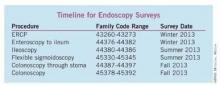 On the following page is a list of upcoming surveys. We also urge you to add your name to the roster of individuals to be contacted to complete the RUC surveys of physician work for endoscopic procedures shown in the timeline.
