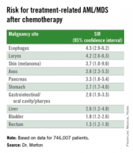 In the cohort, the standardized incidence ratio (SIR) for treatment-related acute myeloid leukemia (tAML) or myelodysplastic syndrome (MDS) was four times greater than would be expected in the general population, reported Lindsay M. Morton, Ph.D., of the division of cancer epidemiology and genetics at the National Cancer Institute in Bethesda, Md.