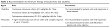 Despite advances in targeted therapies for HCL, because no treatment has been shown to extend the treatment-free interval longer than chemotherapy, treatment with a purine nucleoside analog is usually the recommended first-line therapy. This includes either cladribine or pentostatin. Both agents appear to be equally effective, and the choice of therapy is determined by the treating physician based on his or her experience. Cladribine administration has been studied using a number of different schedules and routes: intravenous continuous infusion (0.1 mg/kg) for 7 days, intravenous infusion (0.14 mg/kg/day) over 2 hours on a 5-day regimen, or alternatively subcutaneously (0.1–0.14 mg/kg/day) on a once-per-day or once-per-week regimen (Table 2).28,29