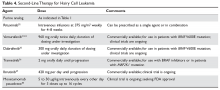 Ibrutinib, a Bruton tyrosine kinase inhibitor, and moxetumomab pasudotox, an immunotoxin conjugate, are currently being studied in National Institutes of Health–sponsored multi-institutional trials for patients with HCL. Ibrutinib is administered orally at 420 mg per day until relapse.44 Moxetumomab pasudotox was tested at different doses between 5 and 50 μg/kg intravenously every other day for 3 doses for up to 16 cycles unless they experienced disease progression or developed neutralizing antibodies.45 Both agents have been shown to have significant activity in cHCL and vHCL and will likely be included in the treatment armamentarium once trials are completed. Second-line therapy options are summarized in Table 4.