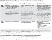 Diagnostic criteria for PV and ET according to the World Health Organization (WHO) classification30 are summarized in Table 1. Criteria for the diagnosis of prefibrotic myelofibrosis are included as well since this entity was formally recognized as separate from ET and part of the PMF spectrum in the 2016 WHO classification of myeloid tumors.30
