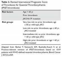 Traditionally, in ET patients, thrombotic risk was assessed using the same 2 factors (age ≥ 60 years and prior history of thrombosis), separating patients into low- and high-risk groups. However, the prognostication of ET patients has been refined recently with the identification of new relevant factors. In particular, the impact of JAK2 mutations on thrombotic risk has been thoroughly studied. Clinically, the presence of JAK2V617F is associated with older age, higher hemoglobin and hematocrit, lower platelet counts, more frequent need for cytoreductive treatment, and greater tendency to evolve into PV (a rare event).41,42 Many,41,43–46 but not all,47–51 studies suggested a correlation between JAK2 mutation and risk of both arterial and venous thrombosis. Although infrequent, a JAK2V617F homozygous state (ie, the mutation is present in both alleles) might confer an even higher thrombotic risk.52 Moreover, the impact of the JAK2 mutation on vascular events persists over time,53 particularly in patients with high or unstable mutation burden.54 Based on JAK2V617F’s influence on the thrombotic risk of ET patients, a new prognostic score was proposed, the International Prognostic Score for ET (IPSET)-thrombosis (Table 2). The revised version of this model is currently endorsed by the National Comprehensive Cancer Network and divides patients into 4 risk groups: high, intermediate, low, and very low. Treatment recommendations vary according to the risk group (as described below).55