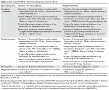For both patients with PV and ET the endpoint of treatment set forth for clinical trials has been the achievement of a clinicohematologic response. However, studies have failed to show a correlation between response and reduction of the thrombohemorrhagic risk.114 Therefore, proposed clinical trial response criteria were revised to include absence of hemorrhagic or thrombotic events as part of the definition of response (Table 3).94