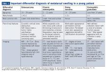 A number of differentials, including benign tumors, are to be kept in mind when diagnosing and treating such patients (Table 2) . The most common benign tumors affecting the metatarsal are giant cell tumors (GCT) followed by chondromyxoid fibroma. Osteosarcomas and Ewing sarcomas constitute the malignant tumors. 12 Occasionally, infections like osteomyelitis of the small bones may mimic malignancy. The absence of an extensive soft tissue component and/or calcifications with the presence of bony changes (like sequestrum) favors a diagnosis of infection/osteomyelitis. In addition, clinical findings like fever, skin redness, and presence of a painful swelling (especially after onset of fever) point to an inflammatory pathology rather than malignancy. Stress fractures rarely simulate tumors. MRI showing marrow and soft tissue edema with a visible fracture line points to the diagnosis.