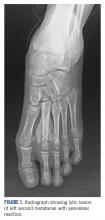Osteosarcomas are the most common primary malignant bone tumor in children and adolescents. Although predominantly occurring in pediatric and adolescent age groups, bimodal distribution (with a second incidence peak occurring in the sixth and seventh decades) is not uncommon. 1 Osteosarcomas of the foot and small bones represent a rare and distinct clinical entity. This must have been a well-known observation for years that led to Watson-Jones stating, “Sarcoma of this [metatarsal] bone has not yet been reported in thousands of years in any country.” 2 The incidence of osteosarcomas of the foot is estimated to be from 0.2% to 2%. 3