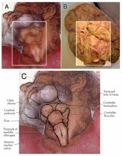 The odd depiction of God's neck in "Separation of Light From Darkness" (A) bears a striking resemblance to a brainstem, seen in tissue from a cadaver (B) and outlined in the painting (C). Photo courtesy of Johns Hopkins Neurosurgery