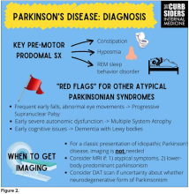 I hadn’t been as aware of the premotor symptoms: constipation, hyposmia (loss of sense of smell), and rapid eye movement sleep behavior disorder. If patients have those early on and they aren’t explained by other things (especially the REM sleep behavior disorder), you should really key in because those patients are at risk of developing Parkinson’s years down the line. Those symptoms could present first, which just kind of blew my mind.