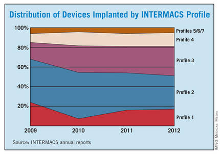 The INTERMACS registry numbers show that the field is currently stuck when it comes to INTERMACS levels, with the greatest number of LVADs going into level 2 patients, who received 34% of U.S LVADS during January-March 2012. The 34% level in early 2012 was down from 38% of LVAD recipients in 2011 and 47% in 2010, but growth in less-severe levels has been slow. At the start of 2012, 30% of LVAD recipients were at level 3, a small increase from the 27% rate in 2011 and 2010. Level 4 patients constituted 14% of LVAD recipients in early 2012, essentially unchanged from the prior 2 years, and level 5, 6, or 7 patients have consistently been a small slice of the U.S. LVAD pie, roughly 5% of recipients each year.