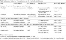 Due to the risk for later recurrences with HR-positive breast cancer, more patients and oncologists are considering extended endocrine therapy. This is based on results from the ATLAS (Adjuvant Tamoxifen: Longer Against Shorter) and aTTOM (Adjuvant Tamoxifen–To Offer More?) studies ( Table 2 ), both of which showed that women with HR-positive breast cancer who continued tamoxifen for 10 years had a lower late recurrence rate and a lower breast cancer mortality rate compared with those who stopped at 5 years [41,42]. Furthermore, the NCIC MA.17 trial evaluated extended endocrine therapy in postmenopausal women with 5 years of letrozole following 5 years of tamoxifen. Letrozole was shown to improve both disease-free and distant disease–free survival. The overall survival benefit was limited to patients with node-positive disease [43].