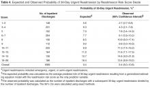 There were 1689 hospital inpatient discharges for 1515 patients during the study period. In this population, the mean age was 64 ± 17 years, 50% were female, and 87% were Caucasian. Additional characteristics are reported in Table 2 . Of the 1689 hospital inpatient discharges, 159 (9.4%) resulted in a 30-day urgent readmission and 190 (11.2%) resulted in any 30-day readmission. Among the 1515 patients, 57 (3.8%) died within 30 days of discharge.The RRS was significantly associated with 30-day urgent readmission (odds ratio [OR] for 1-point increase in the RRS, 1.07 [95% confidence interval {CI} 1.05–1.10]; P < 0.001). A c statistic of 0.612 (95% CI 0.570–0.655) indicates that the RRS has some ability to discriminate between those with and without a 30-day urgent readmission ( Figure, Table 3 ). The expected and observed probabilities of 30-day urgent readmission were similar in each decile of the RRS. The calibration ( Table 4 ) shows that although there is some deviation between the observed and expected probabilities,