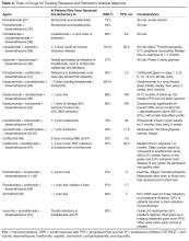 Managing RRMM is by necessity highly individualized and so it is difficult in an article to summarize an algorithm. Data from some of the most relevant trials are presented in Table 2 [11,35–51]. In general, therapy for relapse is dictated largely by what drugs a patient has been treated with before. At the time of first relapse, most patients have been treated previously with some combination of bortezomib and/or lenalidomide, and many patients are on one if not both drugs as maintenance.