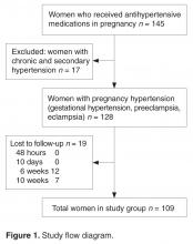Of 145 women approached, 17 were excluded as they had chronic and secondary hypertension. Of the 128 women enrolled, 19 were lost to follow-up; therefore 109 women with complete follow-up were included in the analysis ( Figure 1 ). The obstetric profile of the women, including details of pregnancy hypertension, is shown in Table 1 .In our study, earlier the gestational age at onset of hypertension and earlier gestation at delivery was associated with slower recovery from hypertension ( Table 2 ). Time taken for recovery also was associated with age, BMI, severity of hypertension, associated complications, and the number of antihypertensive medications received (Table 2). Among women who received more than 3 antiphypertensives in pregnancy, nearly 50% continued to have hypertension beyond 6 weeks (Table 2).
