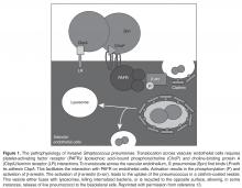 Streptococcus pneumoniae may actually evade the immune system and its inflammatory responses in a very precise manner in order to gain entry into cardiomyocytes [13]. S. pneumoniae has a bacterial adhesion, choline-binding protein A (CbpA), and the cell wall contains phosphorylcholine (ChoP). These 2 agents bind to 2 receptors, lamin receptor (LR) and platelet-activating factor receptor (PAFR) on vascular endothelial cells. In this binding process an endothelial protein is activated which causes endocytosis of the bacteria into a clathrin-coated vesicle, by which the S. pneumoniae either gains transport across the endothelial cell to the myocardium on the other side or dies in a phagolysosome ( Figure 1 ). In the absence of infiltrating immune cells, microlesions (scars) are ultimately formed in the cardiomyocytes. The lesions were found in infected mice, rhesus macaques and in humans at autopsy who died from invasive pneumococcal disease [13].There is likely a high level of variability in how individual patients respond to a predisposing factor for a cardiac complication. For example, one patient may tolerate a mild hypoxia while another is sensitive. The association of inflammatory markers with the presence of cardiac markers, however, would support that once there are systemic reactions, the complications increase. Macrolides, however, were not found to contribute to long-term mortality due to cardiac complications.
