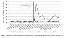 The rate of safety events reported (ie, number of safety events reported/number of patient encounters) was compared for the 2 time periods using Poisson regression or zero-inflated Poisson regression. SASenterprise guide5.1 was used for all analyses. A P value of < 0.05 was considered statistically significant. The protocol was reviewed by the institutional review board of Novant Health Presbyterian Medical Center and a waiver for informed written consent was granted.