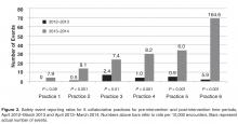 For the year preceding the recruitment and education of the collaborative practices (pre-intervention year), reporting rates for the 6 collaborative practices (1.2 or 19 events reported/154,148 patient encounters) and for the aggregate of 27 comparators (1.5 or 84/568,417) were very similar ( P = 0.47). For the post-intervention year, the collaborative practices’ rate increased to 11.5 (175/152,610, P < 0.001), while the rate for the comparator practices remained stable at 1.5 (81/554,608). Rates remained unchanged as well for all other Novant Health Medical Group practices ( Figure 1 ).Each of the 6 collaborative clinics experienced at least a doubling of reporting rates, and 5 of the 6 clinics significantly increased reporting rates ( Figure 2 ). Practices 1 through 5 had pre-intervention rates of 0 to 2.4 and post-intervention rates of 6.0 to 8.2. Practice 6 increased from 5.9 to 164.6, an increase largely due to reporting of communication issues for this practice. In practice 1, a general surgery practice, reporting increased from 0 events (in 5093 encounters) to 4 events (in 5071 encounters, a rate of 7.9) for the 2 time periods. However, this increase did not reach the level of significance ( P = 0.09). The 3 general surgery clinic comparators together reported 0 safety events for the post-intervention year among 13,793 encounters in clinic.To control for the presence of patient safety coaches in practices, the 3 family medicine clinics (clinics 4 through 6, Figure 2) were each matched 1:3 for size (number of providers) and specialty (other family medicine clinics), also with a patient safety coach. While the rates were significantly increased for the 3 collaborative family medicine clinics ( P < 0.001), only 1 of the comparators clinic’s rate changed significantly (0.2 or 1/44,580 to 1.3 or 6/45,157), and this change was marginally significant ( P = 0.048). This practice was the only one of the 27 comparator clinics to demonstrate any increased rate.