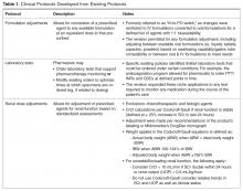 The protocols included in this singular practice policy were designed to allow pharmacists to apply their professional expertise in the areas in which calls to physicians with recommendations for adjusting pharmacotherapy were routinely accepted and/or for which the literature strongly supported improved outcomes with pharmacist involvement. Some protocols evolved from existing programs ( Table 1