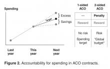 Second, an ACO takes on accountability for both spending and quality. Accountability for spending is manifested through a spending target ( Figure 2 ). Going into an ACO contract, the organization typically assumes a spending target for the upcoming year, which usually takes into account its historical cost trends and the burden of morbidity among its patients. If spending for its patient population ends up below the target by at least a minimum amount (2% in the current contract model), the organization receives a share of the savings. If spending exceeds the target by 2% or more, the organization may not be reimbursed a portion of the difference (often referred to as “downside” risk). In a so-called one-sided ACO contract—the majority of those in the Medicare Shared Savings Program—organizations face only shared savings but do not face shared risk. In two-sided contracts, such as those in the Medicare Pioneer ACO Program and many commercial ACO contracts, organizations face both shared savings and shared risk. In the latter scenario, the spending target can be appropriated called a global “budget.” Accountability for quality is operationalized through quality measurement and reporting. Using the traditional pay-for-performance framework, organizations receive bonus payments for various quality measures. In the Medicare ACO programs, for example, measures are grouped into 4 domains: (1) patient and caregiver experience, such as patients’ ratings of doctors; (2) care coordination and patient safety, such as all-cause readmission rates; (3) preventive health, such as influenza and pneumococcal vaccinations; and (4) specific measures for at-risk populations, such as hemoglobin A1c levels below 8% for patients with diabetes and beta-blockers for patients with left ventricular systolic dysfunction [17]. Accountability for quality and spending can be linked. For example, organizations may only be eligible for shared savings after they achieve a certain minimum quality performance (as in Medicare ACOs), or their shared savings and risk percentages may be tied to the level of quality (some commercial ACOs).