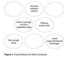 Clinicians may find it helpful to use visual prompts to guide Behavioral Menu conversations [44]. Diagrams with equally weighted spaces assist clinicians to resist prioritizing as might happen in a list. Empty circles alongside circles containing varied options evoke patient ideas, consistent with the Spirit of MI ( Figure 3 , Visual Behavioral Menu Example) [44].