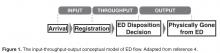 While it is now widely accepted that hospital inpatient overcapacity greatly contributes to crowding in the ED, there are many other factors related to overcrowding that are within the control of the ED. A conceptual model proposed by Asplin partitions ED crowding into 3 interdependent components: input, throughput, and output ( Figure 1 ); this model has recently been accepted as the standard theoretical model for discussing patient flow through the ED by national professional groups such as the Canadian Association of Emergency Physicians [4,5]. Surges can arise from rapid demands in any of these areas, resulting in overall net ED crowding; however, depending on the model component affected, different approaches to solution design may be required. For example, a sudden massive influx of new patients arriving to an ED would cause a surge in the “input” aspect of the model, and response plans should address the issue with actions such as increasing triage capacity, or perhaps calling in additional physician resources in anticipation of looming “throughput” surge. Activating inpatient hospital responses may be premature and ineffective, wasting valuable resources that can be utilized elsewhere. In contrast, ED surges related to “output” factors may be best tackled with hospital-wide responses and resource reallocation.Many of the widely used measurement tools for overcrowding produce one final overall net value on a one-dimensional scale, failing to capture the complexity of the root causes of surges. For example, the National ED Overcrowding Study (NEDOCS) scoring system, validated at various centers and widely used and studied [5–7] utilizes a number of institutional and situational variables to calculate a final NEDOCS score, which translates to “Not Busy,” “Busy,” “Overcrowded,” “Severely Overcrowded,” or “Dangerously Overcrowded” as a global state. Other published scoring systems such as the Emergency Department Work Index (EDWIN), while performing well in comparison to subjective impressions of physicians and nurses, also suffers from computation of a single final score, which makes it difficult to tie to specific actions or solutions [8]. Other surrogate markers quantifying ED crowding have also been used, such as left-without-being-seen rates, ambulance diversions, and total number of boarded patients in the ED; yet they too only measure consequences of crowding and provide little diagnostic information on when and where specific ED surges are actually happening throughout the day [9].
