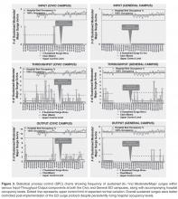 Figure 3 shows SPC charts for the different Input-Throughput-Output components of the 2 different ED campuses over the study period. Daily frequency of sustained high surges lasting 6 or more consecutive hours were plotted along with hospital occupancy levels. The number of times data points rose above the upper limit of the SPC chart (ie, above normal expected variation) pre- and post-intervention were used for statistical comparison. Overall for the 2 campuses combined, the frequency of sustained high surges above normal variation remained stable for Input and Throughput (pre 4.5%, post 0.0%, P = 0.13; pre 3.5%, post 2.7% , P = 0.54) components of the ED flow model, respectively. More importantly, the frequency of sustained high surges in the Output component decreased, reaching statistical significance [pre:7.7% vs post:2.0% , P = 0.01], despite a rise in the total number of times the ED reached severe Output surges and overall hospital occupant levels.