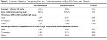 Table 2 presents the summary statistics for both campuses comparing the pre- and post-implementation time periods. During the study period, the average number of daily ED visits decreased slightly by 10 patients per day (pre 439.4, post 429.4, P = 0.04), while the average daily hospital occupancy levels steadily rose above 100% (pre 99.5%, post 101.2%, P = 0.01). Despite rising hospital occupancy levels, the proportion of time the ED reached high surge levels decreased for Input (pre 4.4%, post 2.7%, P = 0.01) and Throughput (pre 20.5%, post 18.1%, P = 0.08) components of ED flow after implementation. The frequency of high surges in the Output component did significantly increase (pre 7.7%, post 10.8%, P = 0.002).