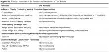 counseling training such as those offered by the Obesity Society, Harvard Medical School Department of Continuing Education (eg, Blackburn Course in Obesity Medicine), and the Cleveland Clinic Center for Continuing Education (eg, Annual Obesity Summit). (See Appendix for contact information.)
