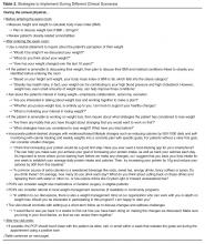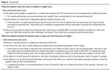 While seeking additional training is a good option, PCPs can incorporate some strategies into their current routines with obese patients as outlined in Table 2 , which integrates aspects of motivational interviewing with the 5A’s strategy discussed above into a practical framework. Many of these elements are grounded in psychological theory and supported by evidence [81,82]. First, PCPs should plan to specifically discuss weight loss and dedicate time to discuss this issue with their obese patients. This task may be more easily accomplished during the patient’s annual physical where providers typically allocate longer time for the appointment and patients may be more likely to anticipate a discussion of preventive health issues. However, if the patient raises the issue, providers need to be prepared to address weight loss or at least