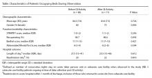 Patient population characteristics remained stable during the course of the QI activity; there were no significant differences in the observed patient characteristics pre- and post-QI activity (Table). In 51 hours of observation undertaken by 3 independent observers there were 80 and 71 occupied beds before and after QI activity, respectively, representing a stable bed occupancy rate of 94% and 83% (P = 0.074). Of the occupied beds, 98.7% and 98.6% of patients (pre- and post-QI activity, respectively) were considered recuperating and therefore appropriate for a restorative care approach.