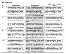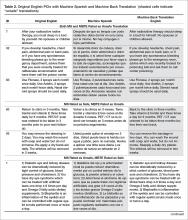 The bilingual panel identified 11 translations (either machine Spanish or MBTE) as unsafe: MS translation was unsafe for 9 items, MBTE unsafe for 5 items, with some items identified as unsafe in terms of both machine Spanish and MBTE. The original English, machine Spanish, and MBTE for these PCIs are listed in Table 2. One item (#93) revealed a machine Spanish drug dosing ambiguity that was not present in the MBTE, with safety concern expressed by 3 of 4 bilingual raters.