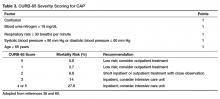 A modification to the CURB-65 algorithm tool was CRB-65, which excludes urea nitrogen, making it optimal for determinations in a clinic-based setting. It should be emphasized that these tools do not take into account other factors that should be used in determining location of treatment, such as stable home, concerns about compliance, mental illness, or concerns about compliance with medications. In many instances it is these factors that preclude low risk patients from being treated as outpatients [37,38]. Similarly, these scoring systems have not been validated for immunocompromised patients or those who would qualify as having healthcare-associated pneumonia.Patients with CURB-65 scores of 4 or 5 are considered to have severe pneumonia and admission to the ICU should be considered. Aside from the CURB-65 score, anyone requiring vasopressor support or mechanical ventilation merits admission to the ICU [16]. IDSA/ATS guidelines also recommend the use of “minor criteria” for making ICU admission decisions; these include respiratory rate ≥ 30 breaths / minute, PaO2 fraction ≤ 250, multilobar infiltrates, confusion, blood urea nitrogen ≥ 20 mg/dL, leukopenia, thrombocytopenia, hypothermia and hypotension [16]. These factors are associated with increased mortality due to CAP and admission to an ICU is indicated if 3 of the minor criteria for severe CAP are present.