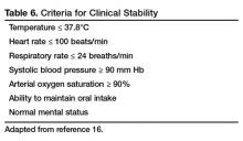 Hospitalized patients do not need to be monitored for an additional day once they have reached clinical stability (Table 6), are able to maintain oral intake, and have normal mentation, provided that other comorbidities are stable and social needs have been met [16]. Patients discharged from the hospital with instability have higher risk of readmission or death [55].