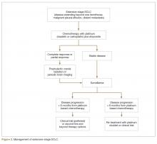 For extensive-stage SCLC, chemotherapy is the mainstay of treatment, with the goals of treatment being prolongation of survival, prevention or alleviation of cancer-related symptoms, and improvement in quality of life. The combination of etoposide with a platinum agent (carboplatin or cisplatin) is the preferred first-line treatment option (Figure 2).