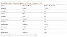 Despite being exquisitely chemo-sensitive, SCLC is associated with very poor prognosis largely because of invariable disease progression following first-line therapy and lack of effective second-line treatment options that can lead to appreciable disease control. The choice of second-line treatment is predominantly determined by the time of disease relapse since first-line platinum based therapy. If this interval is 6 months or longer, re-treatment utilizing the same platinum doublet is appropriate. However, if the interval is 6 months or less, second-line systemic therapy options should be explored. Unfortunately, the response rate tends to be less than 10% with most of the second-line therapies in platinum-resistant disease (defined as disease progression within 3 months of receiving platinum-based therapy). If the disease progression occurs between 3 to 6 months since platinum-based therapy, the response rate with second-line chemotherapy is in the range of 25% [54,55]. A number of second-line chemotherapy options have been explored in small studies, including topotecan, irinotecan, paclitaxel, docetaxel, temozolomide, vinorelbine, oral etoposide, gemcitabine, bendamustine, and CAV (cyclophosphamide, adriamycin, vincristine) (Table 2).