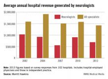 Average annual hospital revenue generated by neurologists decreased almost 24% from 2010 to 2013, according to a survey by physician job placement firm Merritt Hawkins.
