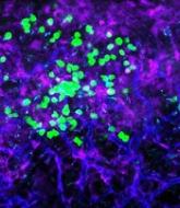 with blood vessels (blue). Image courtesy of UC San Diego Health Preclinical research suggests the cell surface molecule CD98 promotes acute...