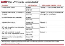 There are few contraindications to LARC methods, making them an appropriate choice for most women. The US Medical Eligibility Criteria for Contraceptive Use, 2010, published by the Centers for Disease Control and Prevention (CDC), contain guidelines that are based on the best available evidence.9 Contraceptive methods that are labeled as Category 1 or 2 are not contraindicated for most women. Methods that fall into Category 3 (theoretical or proven risks outweigh the advantages) or Category 4 (unacceptable health risk) are contraindicated (TABLE 2).9