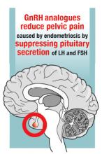 Gonadotropin-releasing hormone (GnRH) analogues, including both GnRH agonists (nafarelin, leuprolide, and goserelin) and GnRH antagonists (elagolix) reduce pelvic pain caused by endometriosis by suppressing pituitary secretion of LH and FSH, thereby reducing ovarian synthesis of estradiol. In the absence of estradiol stimulation, cellular activity in endometriosis lesions decreases and pain symptoms improve. In my practice, I frequently use either nafarelin12 or leuprolide acetate depot plus norethindrone add-back.13 I generally avoid the use of leuprolide depot monotherapy because in many women it causes severe vasomotor symptoms.