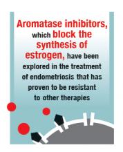 Estrogen is a critically important stimulus of cell activity in endometriosis lesions. Aromatase inhibitors, which block the synthesis of estrogen, have been explored in the treatment of endometriosis that has proven to be resistant to other therapies. Although the combination of an aromatase inhibitor plus a high-dose progestin or GnRH analogue may be effective, more data are needed before widely using the aromatase inhibitors in clinical practice.21