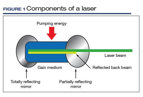 LASER is an acronym for Light Amplification by Stimulated Emission of Radiation. Laser devices are composed of 1) an excitable medium (gas, liquid, solid) needed to emit light, 2) an energy source to excite the medium, 3) mirrors to bounce the light back and forth, and 4) a delivery and cooling system (FIGURE 1).