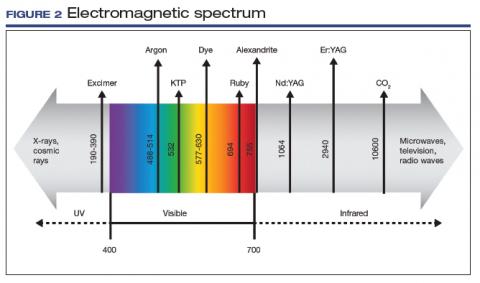 The electromagnetic spectrum is the range of all the wavelengths of light, including visible light, radio waves, infrared light, ultraviolet light, x-rays, and gamma rays (FIGURE 2). Most lasers used for the treatment of vulvovaginal disorders, typically C02 and erbium:yttrium aluminum garnet (Er:YAG) lasers, involve the infrared wavelengths.