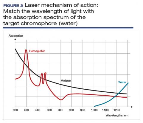 The basic principle of laser treatment is to match the wavelength of the laser with the absorption spectrum of the desired target—a chromophore such as hemoglobin, melanin, or water (FIGURE 3). In essence, light is absorbed by the chromophore (which in vulvar and vaginal tissues is mostly water) and transformed into heat, leading to target destruction. In a fractionated (or fractional) laser beam, the laser is broken up into many smaller beams that treat only portions of the treatment area, with areas of intact epithelium in between the treated areas. At appropriately low thermal denaturation temperatures (45° to 50°C), tissue regeneration can occur through activation of heat shock proteins and tissue growth factors, creating neocollagenesis and neovascularization.