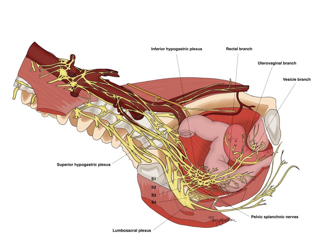 The inferior hypogastric plexi split into the vesical, uterine, and rectal branches, which carry the sympathetic, parasympathetic, and sensory fibers from both the splanchnic and hypogastric nerves. Damage to the inferior hypogastric plexi and/or its branches may induce severe dysfunction to the target organs of the injured fibers.