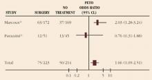 Adding confusion, a second randomized trial—this one from Italy—failed to demonstrate an improvement in fertility among those treated for early-stage endometriosis.23 Nevertheless, when the studies are combined into meta-analysis, surgical treatment of early-stage endometriosis appears to provide a significant improvement in pregnancy rates (odds ratio [OR], 1.66; 95% confidence limits [CL], 1.09-2.51) (Figure 2).