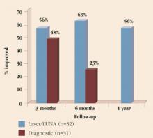 Pain relief. Although there have been many investigations of the effect of endometriosis surgery on pelvic pain, the vast majority are of low quality. No randomized, controlled trials (RCTs) have compared surgery to medical therapy, and only 1 has investigated surgery versus sham surgery. Sutton and colleagues assessed the efficacy of laser laparoscopic surgery in the treatment of pain associated with minimal, mild, or moderate endometriosis.19 They found no difference in pain at 3 months follow-up. However, by 6 months, a clear-cut advantage was seen for surgery (Figure 1). Pain relief also was maintained for at least 1 year in patients undergoing laser surgery. These patients underwent ablation of endometriosis and of the uterosacral nerve (although, as noted earlier, the latter procedure provides no additional pain relief).