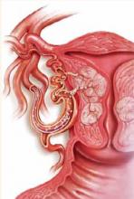 Several series and case reports have noted successful pregnancies following UAE.19,20 Our recent report21 on 50 pregnancies following UAE for leiomyomata noted higher rates of cesarean delivery, preterm delivery, malpresentation, spontaneous abortion, and postpartum hemorrhage than in the general population (TABLE). It is unclear whether the increased rate of premature delivery and malpresentation is due to residual fibroids, changes in myometrial vascularity or elasticity, or other unknown labor-associated processes.
